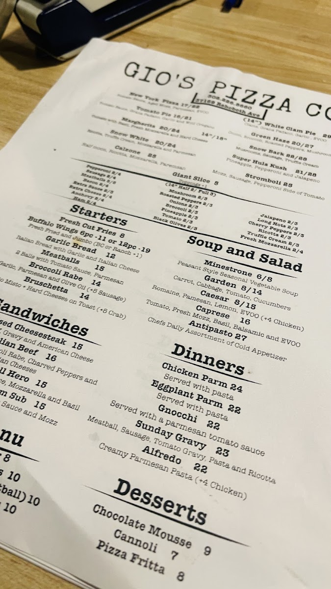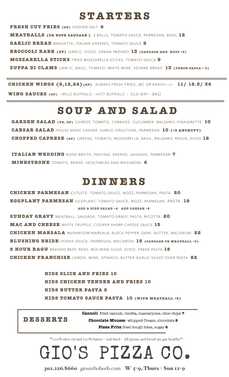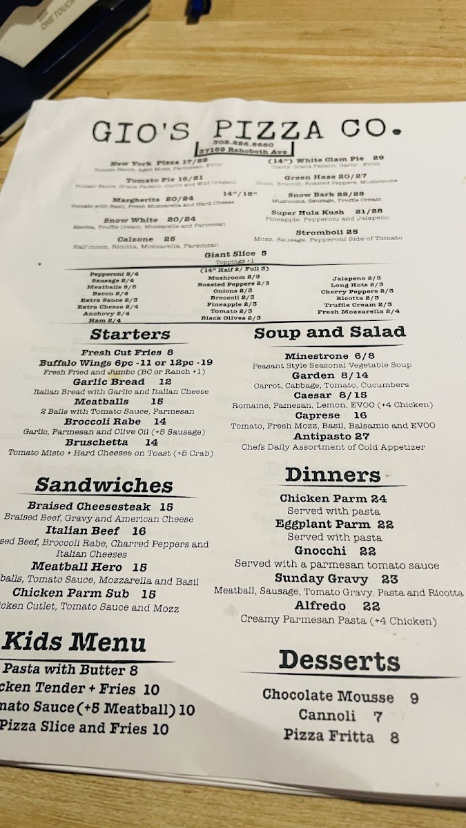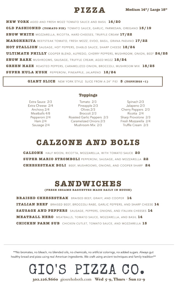 Gio’s Pizza Co. offers an authentic taste of New York-style pizza right in the heart of Rehoboth Beach, DE. Renowned for its thin, perfectly crisp crust, each pizza arrives fresh from the oven with bubbling cheese and a fragrant aroma that tantalizes the senses. The menu goes beyond classic pies, featuring hearty Italian dinners like Chicken Parmigiana served with pasta, creamy Alfredo, and the rich Sunday Gravy packed with meatballs, sausage, and ricotta. Toppings are generous and diverse, from savory pepperoni and mushrooms to unique options like truffle and ricotta. Complement your meal with delightful desserts such as Chocolate Mousse or Cannoli. Customers rave about the quality of ingredients, warm hospitality, and the family-friendly ambiance. Whether you’re craving a giant slice loaded with fresh toppings or a comforting Italian dinner, Gio’s Pizza Co. delivers consistently satisfying flavors in a welcoming setting that feels like a true slice of Italy by the shore.